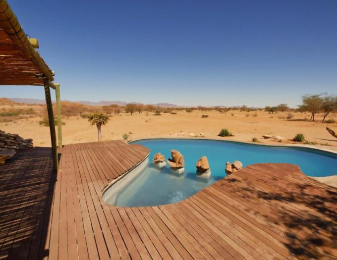 L’un des grands atouts du lodge réside dans sa localisation. À 83 kilomètres des dunes de Sossusvlei, l’un des sites les plus iconiques du pays, il constitue une base stratégique pour organiser une journée d’exploration. Les dunes géantes, qui se teintent d’orange brûlé au lever du soleil, font partie des paysages les plus photographiés au monde. À proximité se trouve aussi Sesriem Canyon, formation rocheuse spectaculaire, creusée par la rivière Tsauchab.