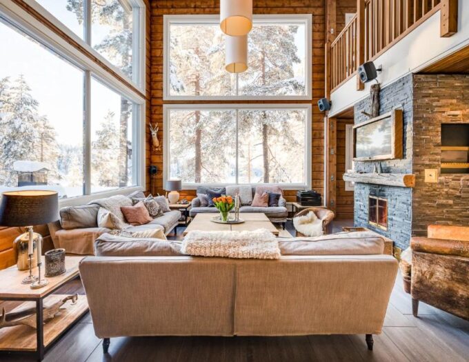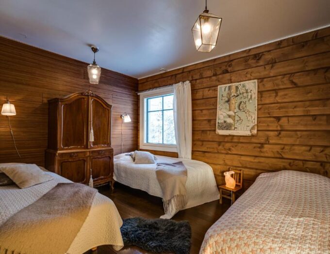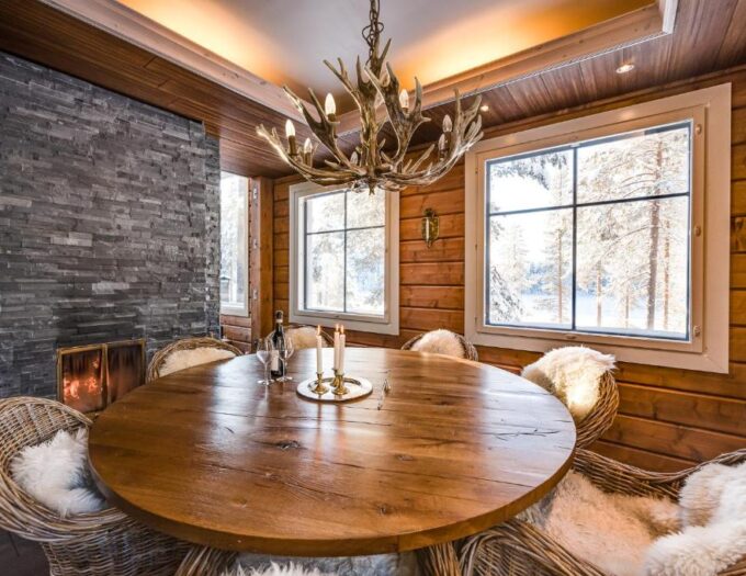 The Little Elk Lodge propose des hébergements spacieux et soigneusement aménagés, dans une atmosphère typiquement finlandaise. Le design intérieur mêle bois clair, lignes épurées et lumière naturelle, créant un cocon douillet où il fait bon se détendre après une journée d’activités en plein air. Les grandes baies vitrées ouvrent sur les paysages environnants, permettant de profiter pleinement de la lumière nordique et des panoramas montagneux.