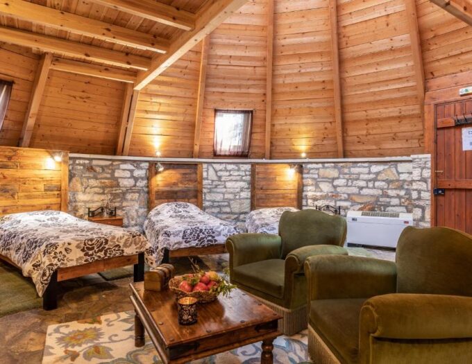 Situé à quelques kilomètres de la grotte d’Anemotrypa, Theasis Igloo Lodge propose une expérience rare dans les montagnes d’Épire : séjourner dans de véritables igloos contemporains, ouverts sur un paysage brut et silencieux. Ici, les courbes architecturales répondent à celles des collines environnantes, et la nature devient la première présence du séjour.
