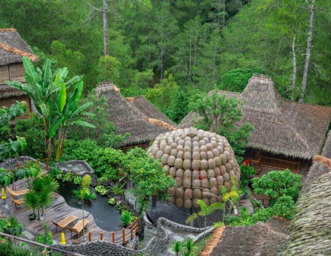 Le lodge comprend également un restaurant panoramique, où les convives dégustent une cuisine variée : spécialités indonésiennes, plats chinois et recettes américaines. Des options végétariennes et végétaliennes sont proposées, préparées à partir d’ingrédients locaux et frais. Chaque repas devient une expérience sensorielle, sublimée par les paysages environnants.