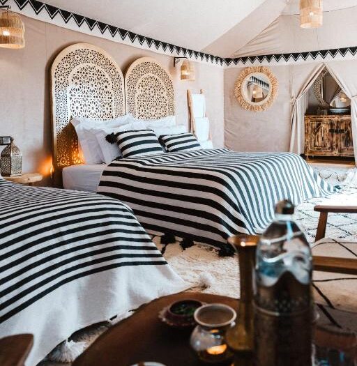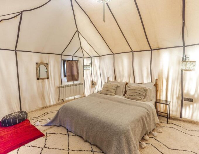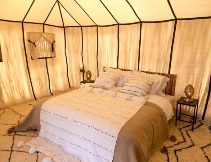 Le lodge propose des tentes de luxe soigneusement aménagées pour offrir un confort discret tout en restant fidèle à l’esprit saharien. Chaque tente dispose d’un espace de vie chaleureux, décoré avec des matériaux naturels, des tons terreux et des textures inspirées de l’environnement désertique. Le mobilier allie élégance et fonctionnalité, et la salle de bains privative permet de se rafraîchir après une journée passée sous le soleil du désert. La disposition des tentes offre également une intimité totale, permettant à chaque invité de se retirer dans un espace personnel tout en restant connecté à la beauté du désert. Le contraste entre le luxe simple des installations et la sauvagerie du paysage environnant crée une expérience immersive qui reste gravée dans la mémoire.
