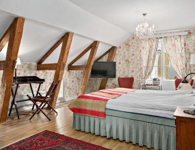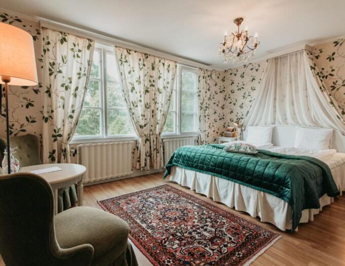 Les chambres de Toftaholm Herrgård allient le charme de l’ancien au confort moderne, dans une ambiance chaleureuse et romantique. Chaque chambre, baignée de lumière naturelle, se distingue par une décoration colorée et soignée, avec un mobilier élégant et des textiles délicats qui rappellent les grandes maisons de campagne d’autrefois.